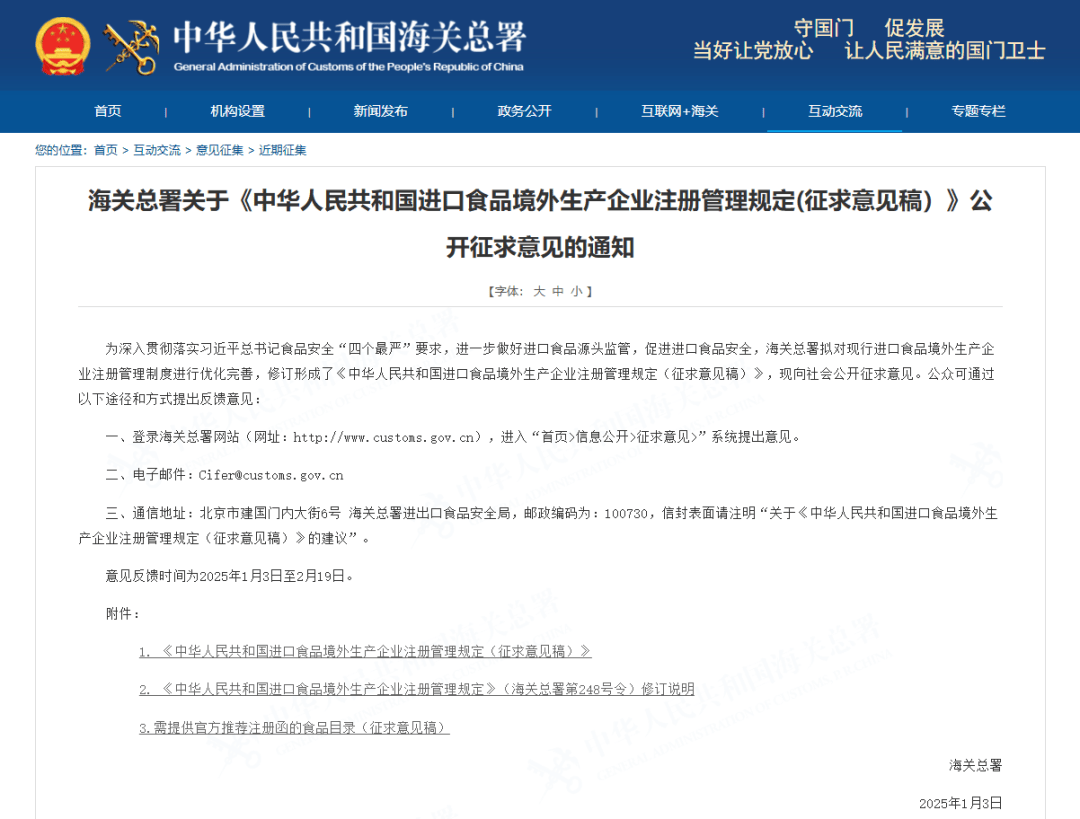 对比现行的《中华人平易近国进口食物境外出产企业注册办理(2021版)》,本《收罗看法稿》次要变化如下:引入合做和谈做为注册前提:之前的次要强调所正在国度(地域)的食物平安办理系统要通过海关总署的等效性评估、审查。《收罗看法稿》正在此根本上引入了海关总署取境外签订的合做和谈,包罗进出口食物平安合做和谈、“经认证的运营者”(AEO)互认和谈等,这些能够做为系统承认的前提,从而简化了注册流程。确立新的注册体例:之前的注册体例相对单一,次要依赖于企业自行申请或从管保举。《收罗看法稿》拟将确立新的注册体例,将工场注册取国外的系统承认挂钩。境外国度(地域)获得海关总署系统承认的,其从管向海关总署提交的保举注册清单很可能间接被审批通过并付与正在华注册编号。申请材料愈加明白和简化:之前的对于申请材料的要求可能相对繁琐,且分歧类型的食物可能需要提交分歧的材料。《收罗看法稿》对申请材料进行了愈加明白和简化的,按照注册体例的分歧,例如,对于从管保举注册的企业,需要提交的材料包罗保举函、企业名单、企业身份证件等;而对于企业自行申请注册的环境,所需提交的材料则相对简单。数量变化:《收罗看法稿》拟削减需供给保举注册函的食物目次,从原先的18类降低至11类,此中包罗打消特殊炊事食物、保健食物、调味料、食用油脂等品类的注册要求。这一调全体现了海关基于风险优化分类办理的准绳。这一行动实施的话,将加快海外企业正在中国市场的产物上市和畅通,有帮于推进进口商业、激发市场立异活力。11。 谷物制粉工业产物和麦芽 12。 保鲜和脱水蔬菜以及干豆 13。调味料 14。坚果取籽类海关总署按照对食物的原料来历、出产加工工艺、食物平安汗青数据、消费人群、食用体例等要素的阐发,连系国际老例确定《需供给保举注册函的食物目次》并对外发布,海关总署能够对《目次》前进履态调整。新增免于注册的景象:《收罗看法稿》明白了邮寄、快件、跨境电子商务零售、搭客照顾的食物,以及样品、礼物、赠品、展现品、援帮、免税运营的食物等特定景象下的境外出产企业免于注册。这一为相关行业供给了明白的指点。强化境外从管的监管义务:《收罗看法稿》明白境外从管正在注册前、中、要求其严酷履行本身查抄、保举和监管职责。这有帮于提拔进口食物的平安性和合规性。添加抽检验证和退出承认机制:《收罗看法稿》海关总署有权对保举的注册清单中的企业进行抽检验证,若发觉不合适注册要求的,将不予注册,并可根据风险评估成果终尽头外国度(地域)的系统承认。按照《2024中国进口成长演讲》显示,中国食物进口规模呈现不竭上升趋向,从2001年的93。66亿美元增加到2023年的2171。27亿美元,添加了22。18倍;中国食物进口界食物进口中的地位不竭提拔,从2001年的2。06%提拔至2023年的12。87%。按照海关总署相关描述,注册办理实施3年来,已有170余个国度(地域)的9万家道外食物出产企业获得注册,290余个境外从管部分利用注册系统对华保举企业。前往搜狐,查看更多?。