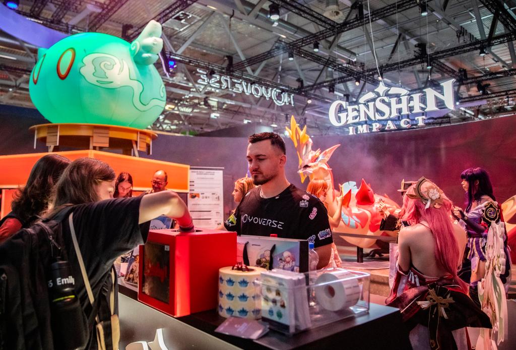 2024年8月22日,人们正在2024年科隆国际逛戏展米哈逛《原神》展台参取互动勾当。记者 张帆 摄。