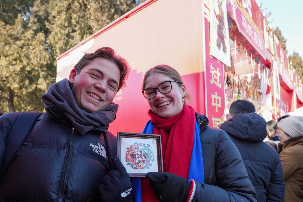 正在地坛庙会上,来自的旅客马克西姆(左一)和莉莎(左二)正在展现采办的留念品(1月29日摄)。记者 鞠焕 摄。