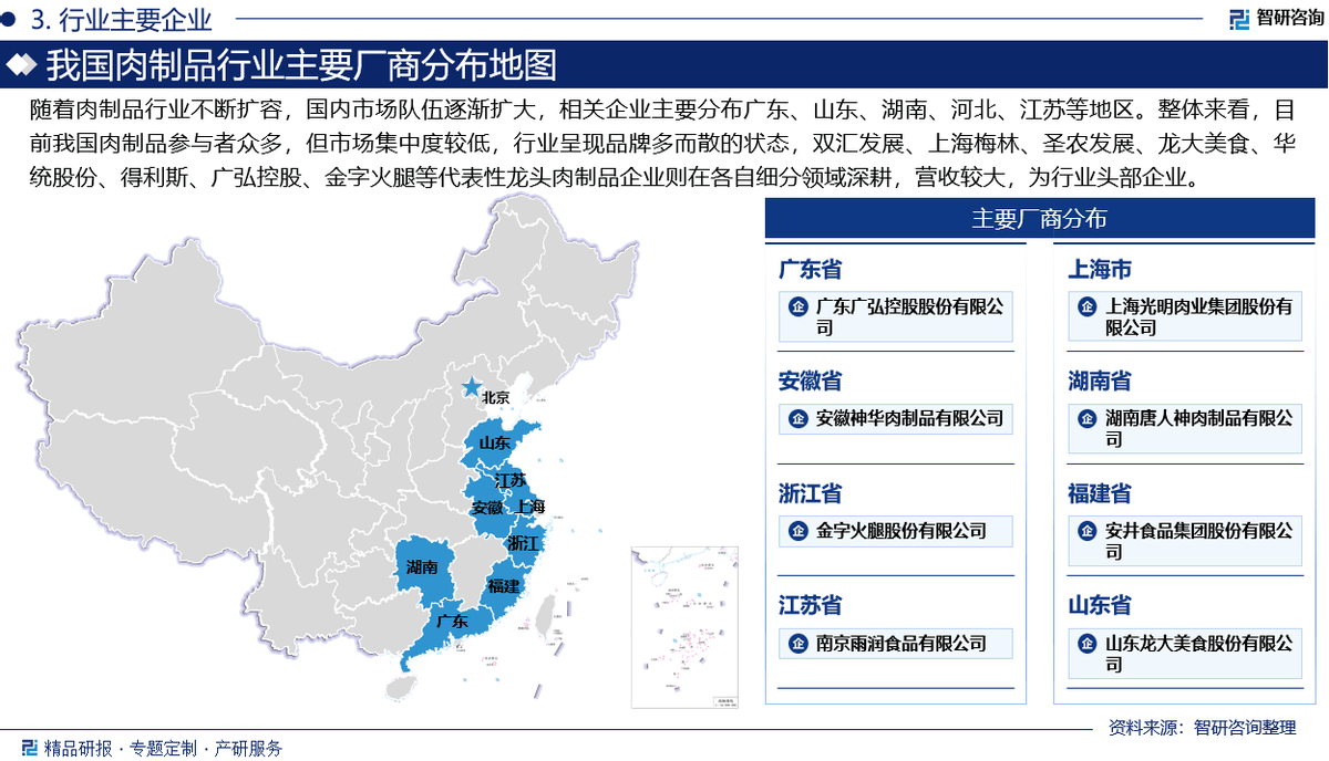 跟着肉成品行业不竭扩容,国内市场步队逐步扩大,相关企业次要分布广东、山东、湖南、、江苏等地域。全体来看,目前我国肉成品参取者浩繁,但市场集中度较低,行业呈现品牌多而散的形态,双汇成长、上海梅林、圣农成长、龙大美食、华统股份、得利斯、广弘控股、金字火腿等代表性龙头肉成品企业则正在各自细分范畴深耕,营收较大,为行业头部企业。