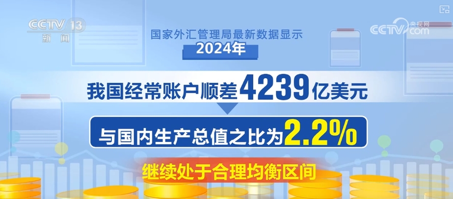 国度外汇办理局最新数据显示,2024年,我国经常账户顺差4239亿美元,取国内出产总值之比为2。2%,继续处于合理平衡区间。来华债券投资净流入468亿美元。2024岁暮,我国对外净资产为3。3万亿美元,增加15。6%。