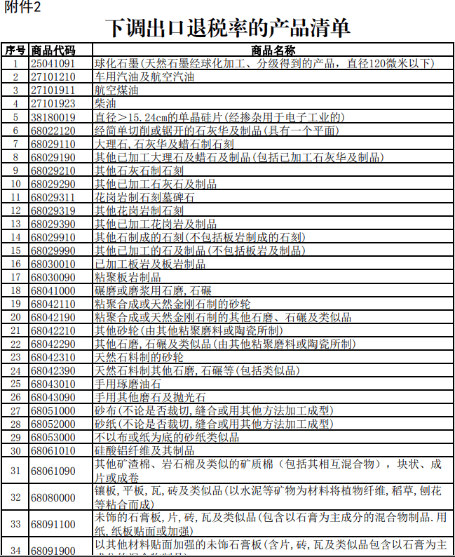一是:打消不产产物的出口退税,包罗化学改性的动、动物或微生物油、铝合金制空心异型材、铜锌合金丝等产物。二是:将部门产物的出口退税率由13%下调至9%,好比成本油、光伏,电池、部门非金属矿物成品。三是:该通知布告自2024年12月1日起实施。而且表白通知布告所列产物合用的出口退税率以出口货色报关单说明的出口日期界定。