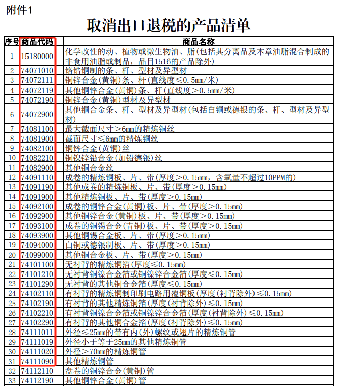 关于打消出口退税的产物清单,总共包含59个产物,铜板,其他铜合金条等,根基都是金属材料一类。